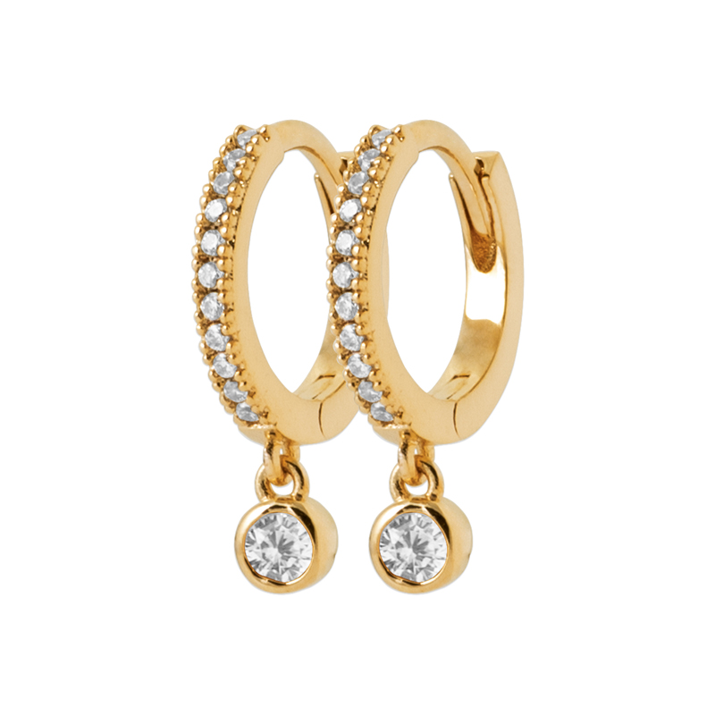 These hoop earrings showcase a round brilliant-cut CZ in a bezel drop, held in a claw-set design. Finished in 18ct yellow plating, they combine modern style with a refined finish.